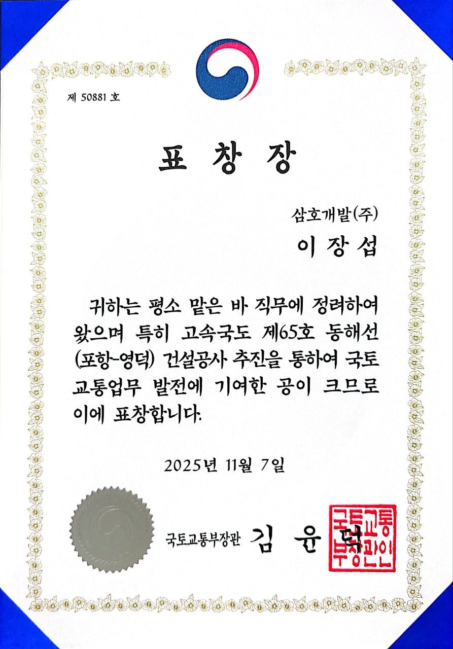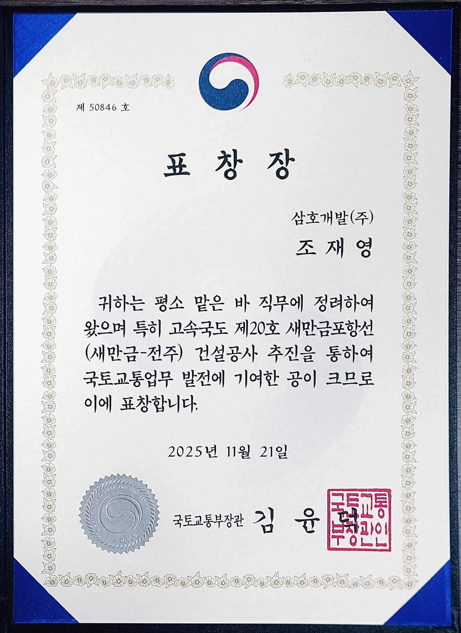 개통식에서 각 삼호개발 현장소장이 국토교통부장관 표창을 수상하는 영예를 안았습니다.