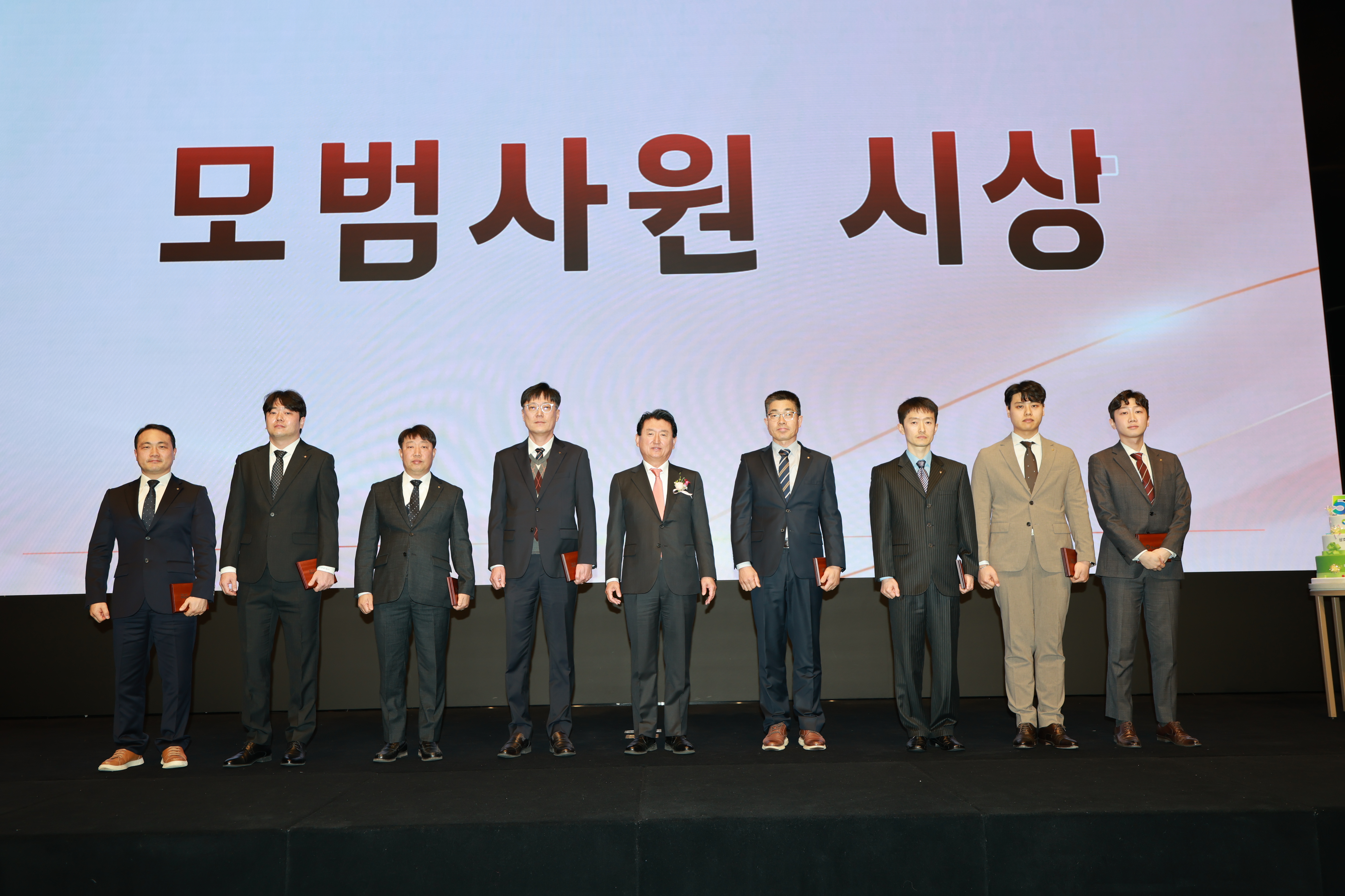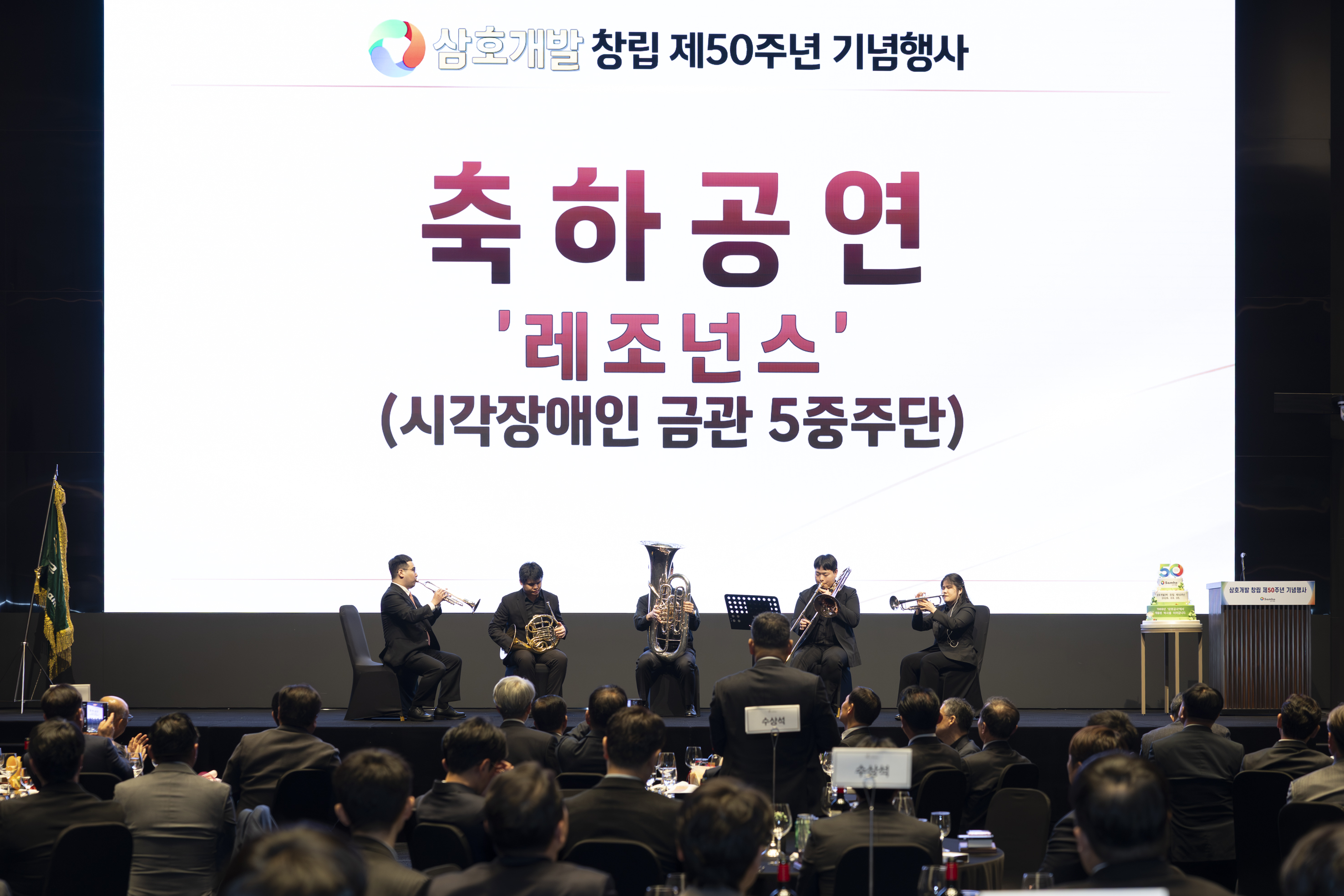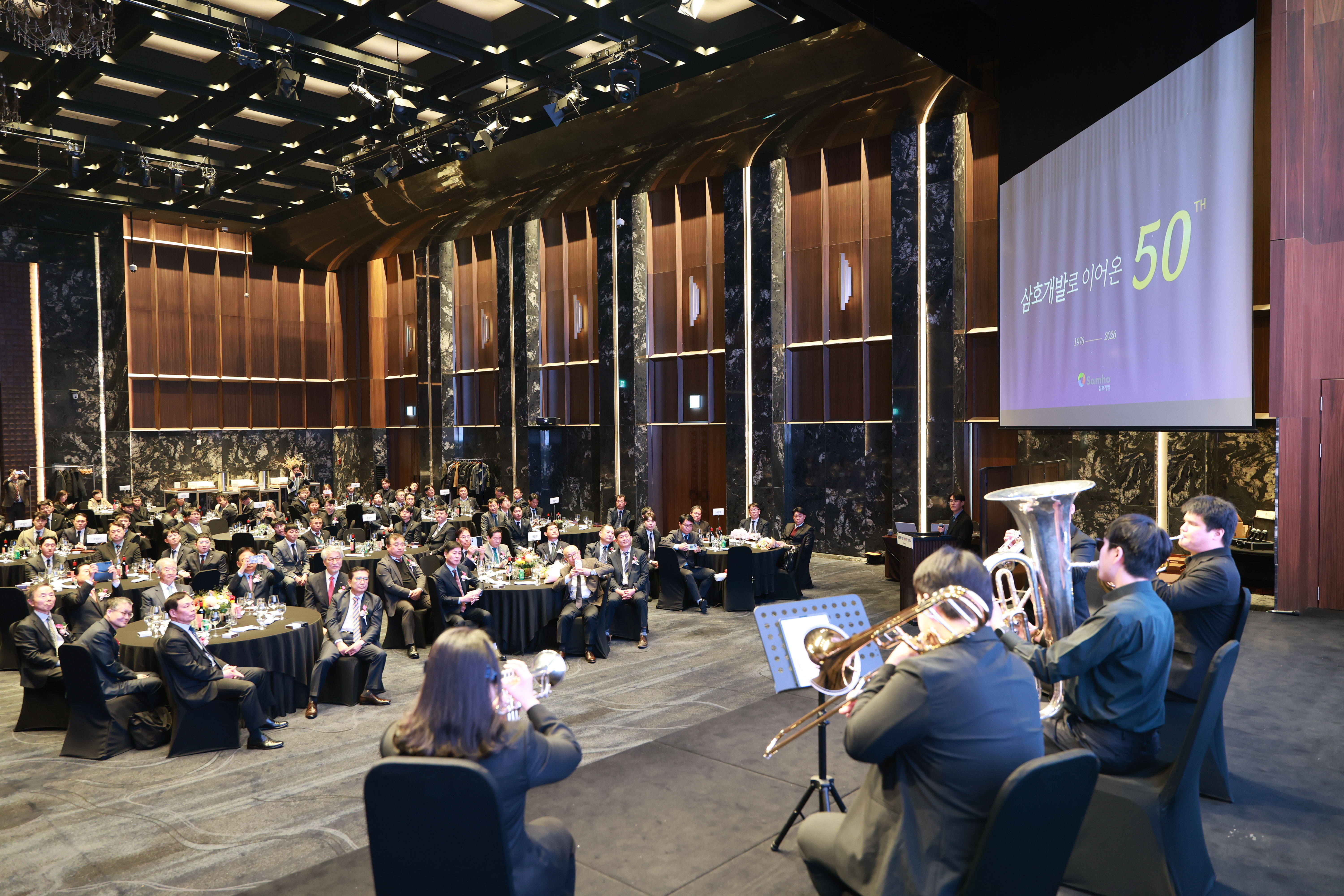 이날 행사에는 수상자로 선정된 임직원을 비롯해 지난 50년의 여정을 함께해 온 인연들이 자리해 창립 50주년을 함께 축하했습니다. 특히 회사 성장 과정에서 동고동락해온 우수 협력사 관계자들과 현장에서 근무하고 있는 태국인 근로자들도 초청하여 약 140여 명이 참석해 삼호개발의 지난 시간을 되돌아보고 축하하는 시간을 함께했습니다. 50년이라는 반세기 시간 속에는 수많은 프로젝트와 삼호개발을 만들어온 사람들의 이야기가 쌓여있습니다. 이번 행사는 그동안의 발자취를 돌아보는 동시에 앞으로의 새로운 도약과 미래를 함께 그려보는 자리로 마련되었습니다. 삼호개발은 창립 50주년을 기념해 제작한 기념 은화를 임직원과 행사 참석자들에게 전달하며 회사의 발자취를 담은 기념영상 상영으로 본 행사를 시작했습니다. 과거의 현장 모습과 삼호개발의 성공적인 성과들..그리고 익숙한 얼굴들이 화면에 등장하자 행사장은 자연스럽게 집중하는 분위기가 흐르기 시작했습니다. 전국 곳곳에 완성된 수많은 삼호개발의 프로젝트 그 뒤에는 삼호개발의 구성원들의 열정과 노력이 있었다는 사실을 다시 떠올리게 하는 순간이었답니다. 이어서 2025년을 빛낸 우수 현장을 시상하는 시간이 진행되었습니다. 안전과 현장 운영에서 뛰어난 성과를 보인 최우수현장과 함께 안전 최우수현장, 무재해 준공현장 시상이 이어지고 어려운 현장 여건 속에서도 책임감있게 현장을 이끌어온 직원들에게도 특별한 격려상이 수여되었습니다. 특히 매년 단 8명만 선발되는 모범사원 시상은 뜨거운 박수 속에 진행되었습니다. 50주년을 맞아 선정된 모범사원에게는 순금주화 5돈과 표창패가 수여되었는데요. 각자의 자리에서 묵묵히 최선을 다해 온 직원들에게 감사의 마음을 전했습니다. 또한 장기근속자 시상은 50년 회사의 역사를 더욱 깊이 느끼게 하는 순간이었습니다. 40년,30년, 20년,10년 근속자들이 무대에 올랐고 근속자에게는 표창패와 순금거북이(10돈)이 수여되었습니다. 특히 40년동안 회사를 지켜온 직원에게는 오랜 헌신에 대한 감사의 마음을 담은 박수가 이어졌답니다. ➖ 심재범 대표이사는 기념사를 통해 "임직원 여러분의 현장 중심의 실천력, 위기 속에서도 흔들리지 않는 책임감, 삼호개발의 성공 DNA 덕분에 역대 최대 매출액과 창사 이래 최초로 신규 수주 4,000억원을 돌파했다"고 말하면서 "올해도 초심으로 돌아가 본연의 업무에 최선을 다해 가장 어려운 건설 환경이지만, 가장 좋은 한해로 만들어가자"며 당부했습니다. ![]() 행사 분위기를 한층 더 풍성하게 만든 것은 시각장애인으로 구성된 금관5중주단의 '레조넌스 브라스'의 축하공연이었습니다. 행사장을 가득 채우는 금관악기의 깊고 웅장한 울림이 지난 50년 동안 수많은 사람들의 노력으로 성장해온 삼호개발의 역사와 어딘가 잘 어울리는 장면이었답니다. 또한 이날 행사에서는 창업주인 이종호 회장님께 공로패를 헌정하는 시간이 마련되었는데요.