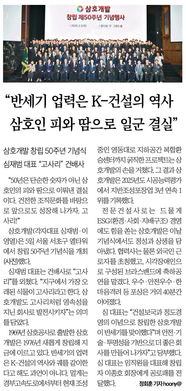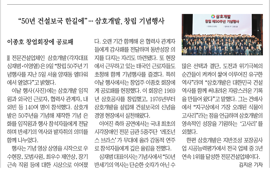 | 삼호개발 창립 50주년 기념식 개최.. 함께 걸어온 50년을 돌아보고 새로운 도약을 다짐하다. | |